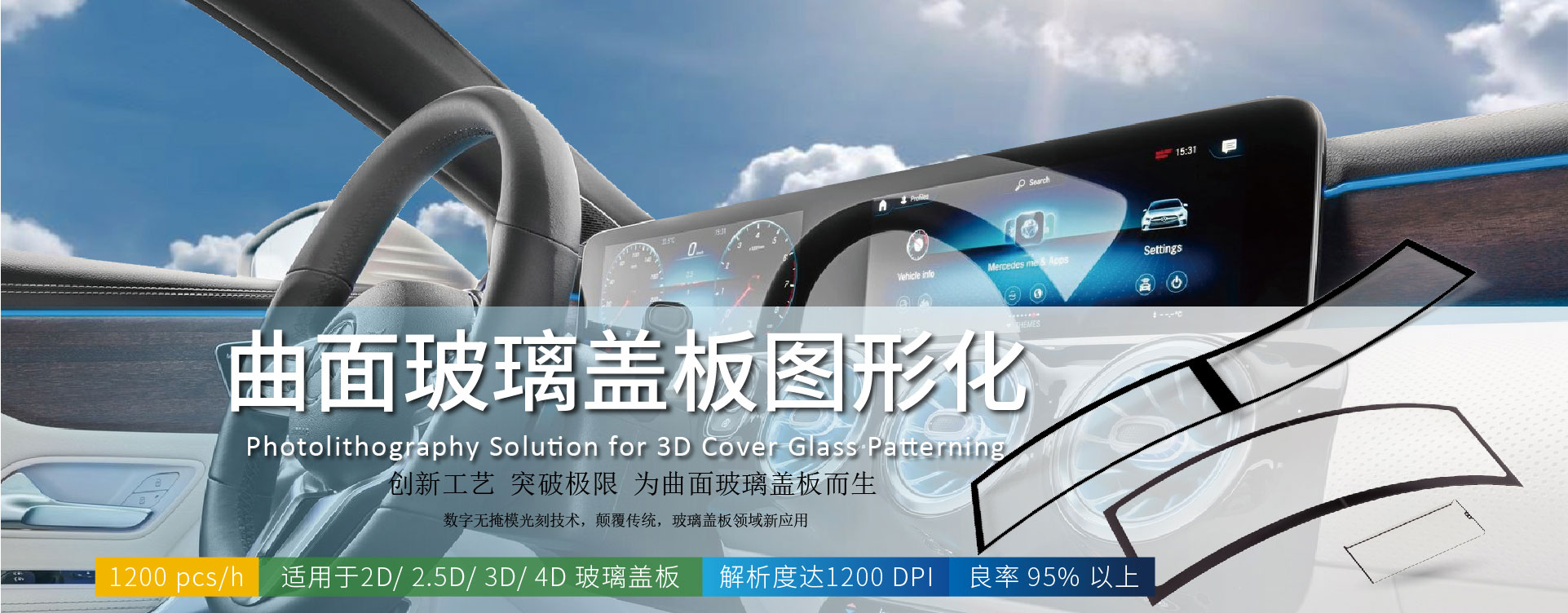 該方案是用于生產3D蓋板玻璃加工需求,適用于曲面蓋板玻璃工藝;附帶相應配合設備,包括全線配備自動上/下料機、平板/等離子清洗機、自動噴涂機、遂道式表干線、直寫式激光曝光機、顯影/清洗機、遂道式固烤線或立式烤箱等輔助設備;高分辨率,高生產率,高產量,更薄的厚度,更高的質量(外觀)低成本;3D Glass LDI適用領域:可穿戴產品,汽車產品,手機產品,家用電器行業等